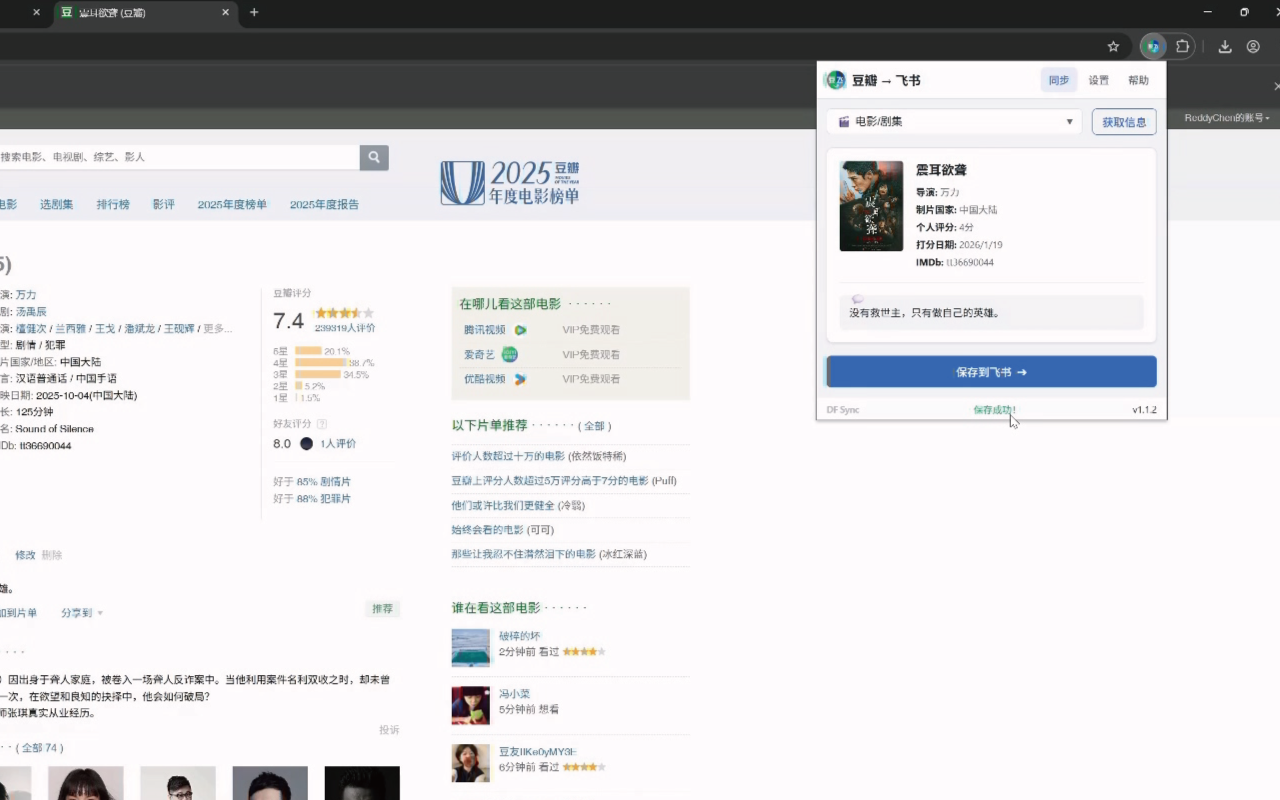 打开豆瓣随便找个电影或图书页面,点插件图标,选好类型,点获取信息。插件会把页面的数据抓出来,展示在面板上。确认没问题,点保存到飞书,搞定。