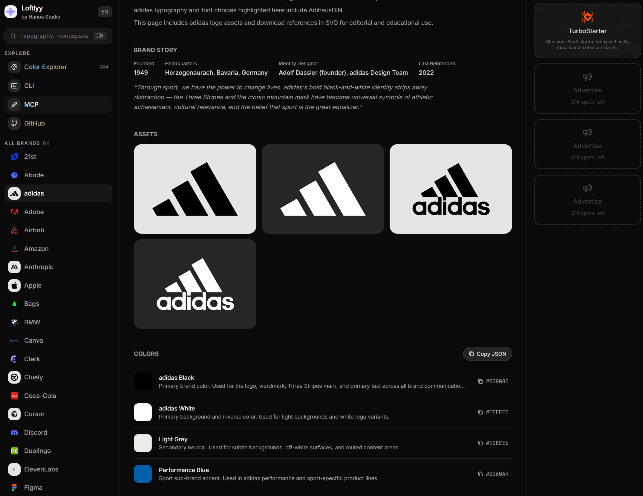 收录持续增长的真实品牌数据库,提供官方品牌视觉资产,包括品牌色彩(黑、白、灰、蓝)、标准字体AdihausDIN及多种格式的商标文件下载。适合品牌设计师寻找灵感和参考。