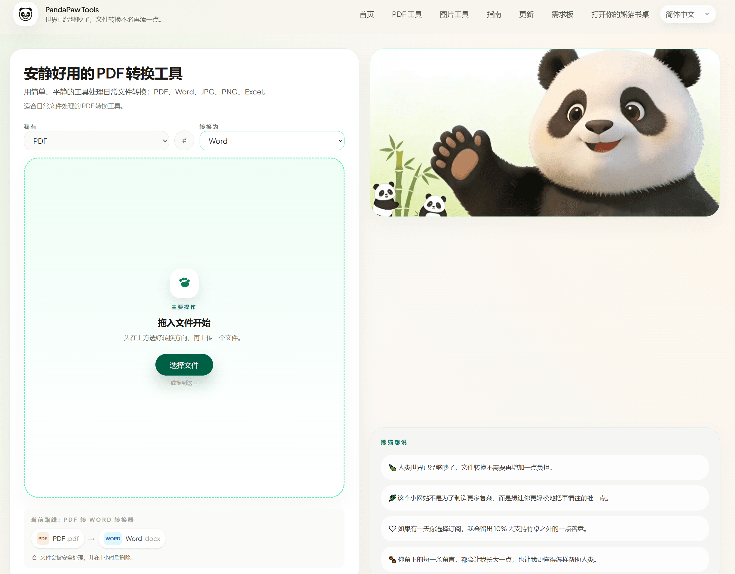 提供PDF、Word、JPG、PNG、Excel等格式间的在线文件转换服务,界面简洁,操作便捷。