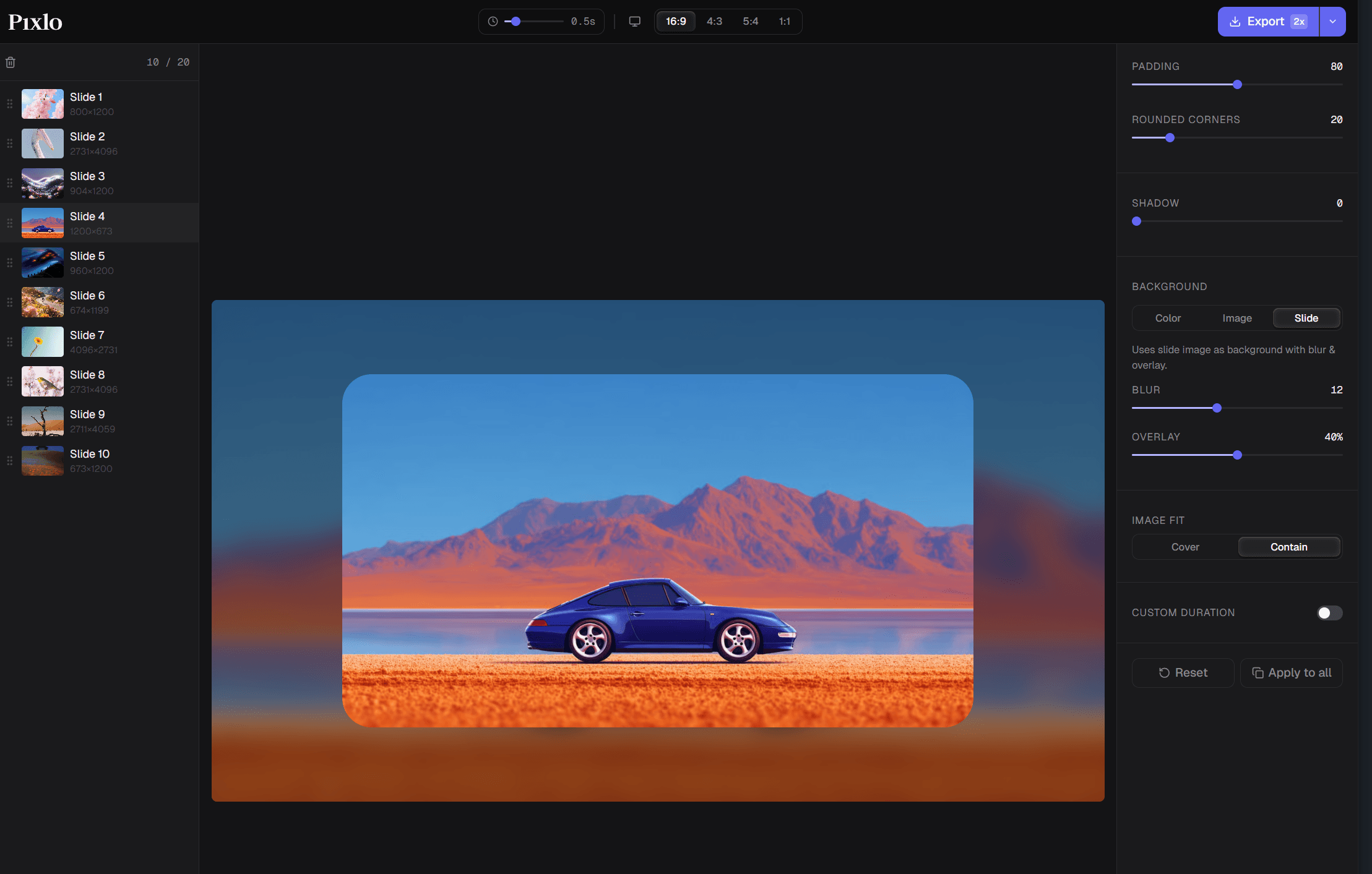 提供幻灯片背景图像的快速编辑功能,支持尺寸调整、模糊、叠加、圆角等视觉参数自定义,可批量应用到所有幻灯片。