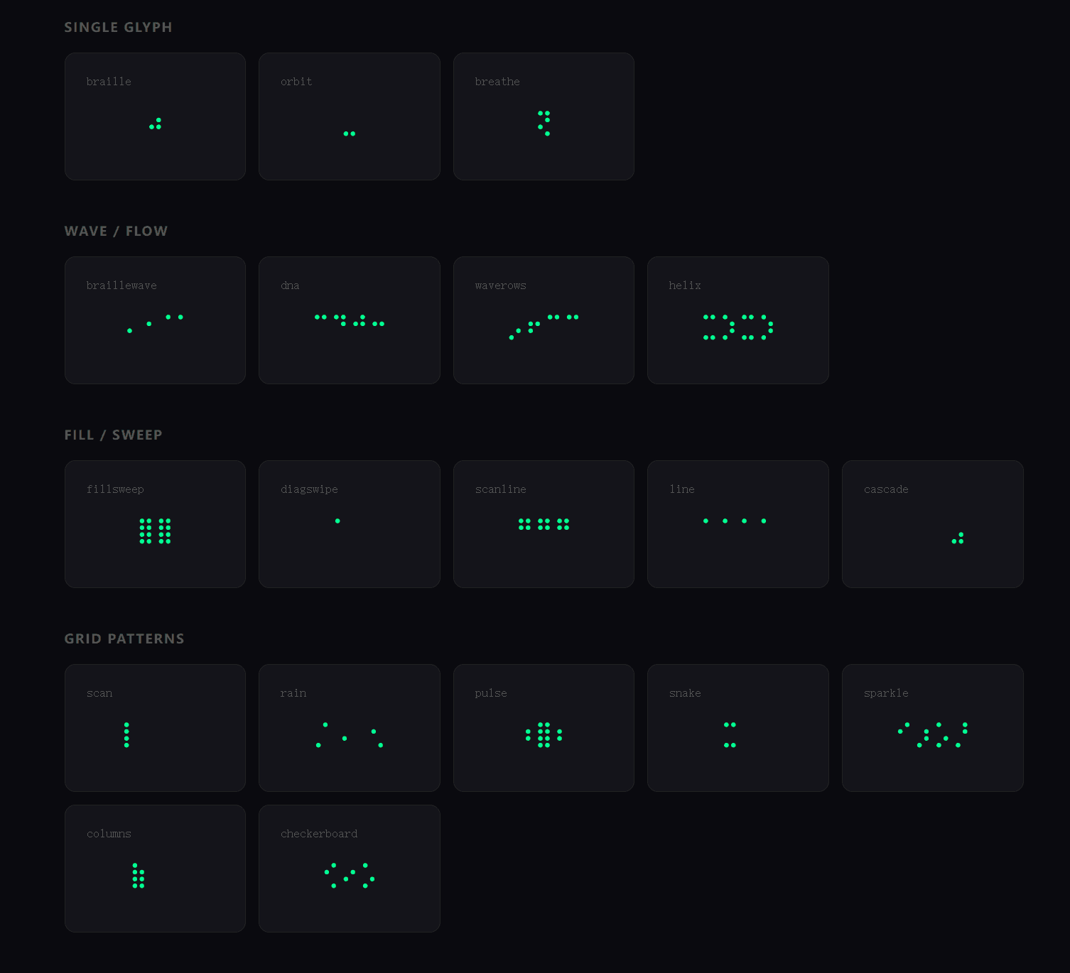 提供丰富的命令行界面加载动画组件,包括多种预设样式、可定制参数和多种集成组件,支持通过钩子和上下文进行自定义渲染与全局配置。
