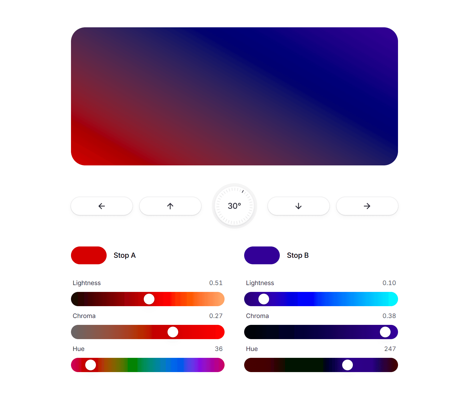 基于OKLCH色彩模型,通过可视化界面交互式创建和调整颜色梯度。支持精确控制亮度、色度和色调参数,并实时预览效果。可以导出自定义设计后渐变背景。
