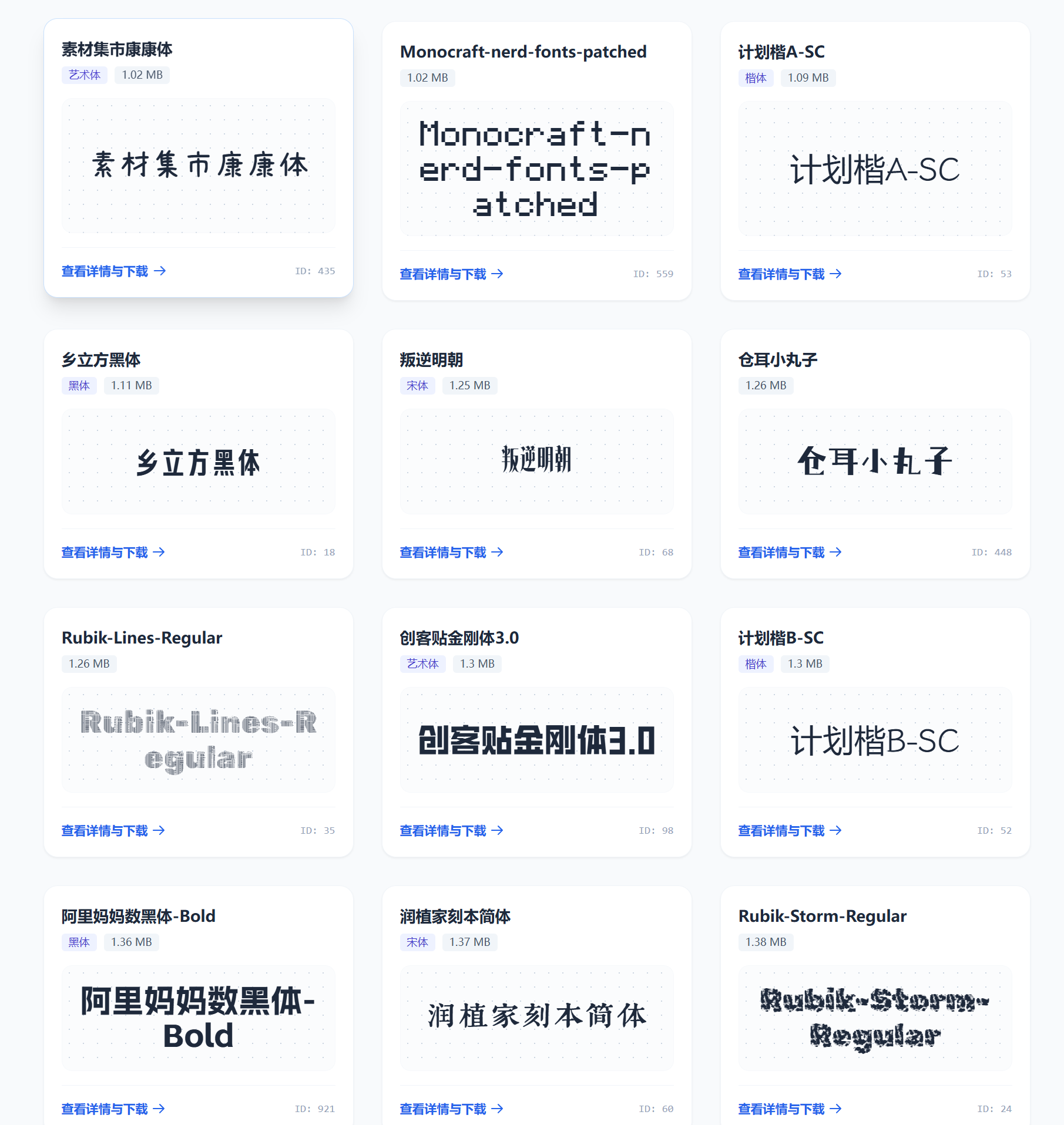 提供多种中英文字体的预览与下载,涵盖艺术体、楷体、黑体、宋体等类别,并标注文件大小与唯一ID,方便用户快速筛选和获取。