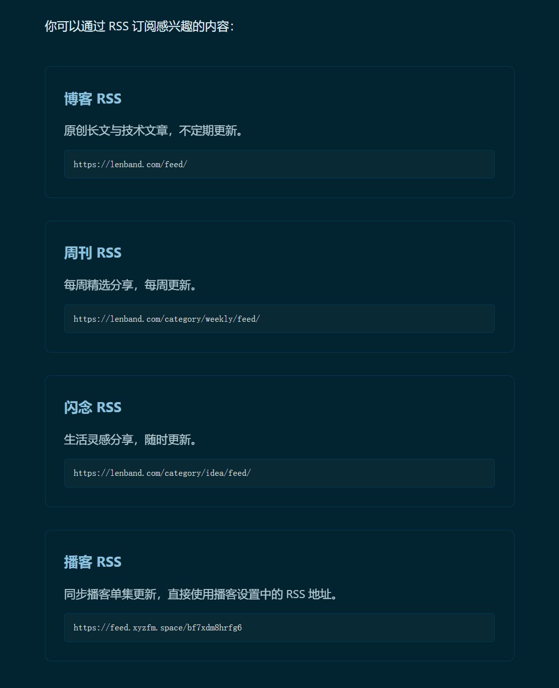 要有独立的 RSS,每个页面,独立 RSS,喜欢读长文,喜欢看朋友圈的人,喜欢听播课的人,可凭所需。